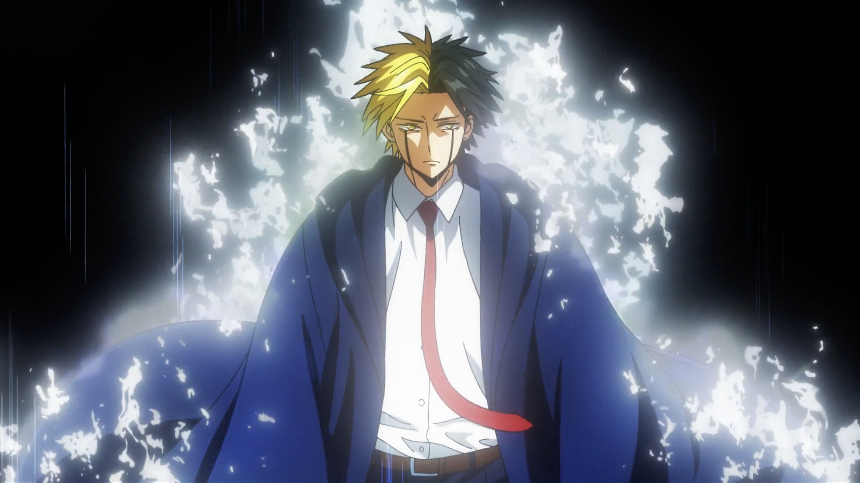 The scene cuts back to the fight, with Rayne Ames using the attack Partisan and Margarette Macaron fighting back with Shiver Sounds and traps him with Howling Sounds. There is a brief cutaway to a discussion about the fight between the Headmaster and a member of the council staff about the number of marks on a person's face. He reveals that Rayne Ames is the youngest person in recorded history to acquire a third mark. This is revealed on his face on the battlefield as well.